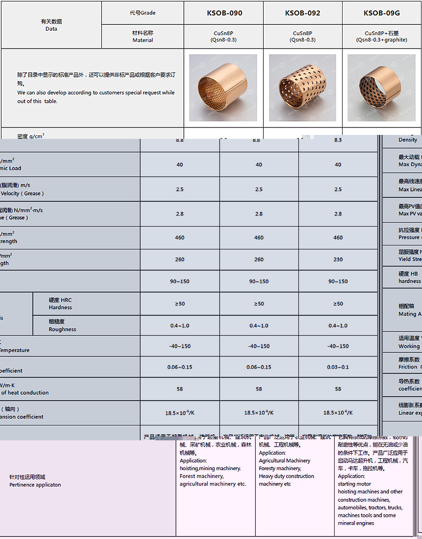 結(jié)構(gòu)特性 以CuSn8 青銅作為基板卷制而成的一種具有高承載、高耐磨的經(jīng)濟(jì)型薄壁銅基卷制軸承。根據(jù)不同的潤(rùn)滑條件,我們可以提供菱形油穴和油孔兩種形式,菱形油穴用于油脂的潤(rùn)滑,通孔用于流體潤(rùn)滑,這樣的設(shè)計(jì)可以確保在軸承運(yùn)行初期就能建立潤(rùn)滑油膜,因此可以降低起始摩擦系數(shù)。 產(chǎn)品應(yīng)用 農(nóng)用機(jī)械、建筑機(jī)械、起重機(jī)、卡車底盤部件、輸送機(jī)、升降機(jī)、卷?yè)P(yáng)機(jī)、校平機(jī)等。 實(shí)際運(yùn)用中根據(jù)使用工況的不同,基體可以采用不同牌號(hào)的合金,表面可以加工成其他形式的油孔和油槽。產(chǎn)品范圍包括:KSOB-090、KSOB-092、KSOB-09G。